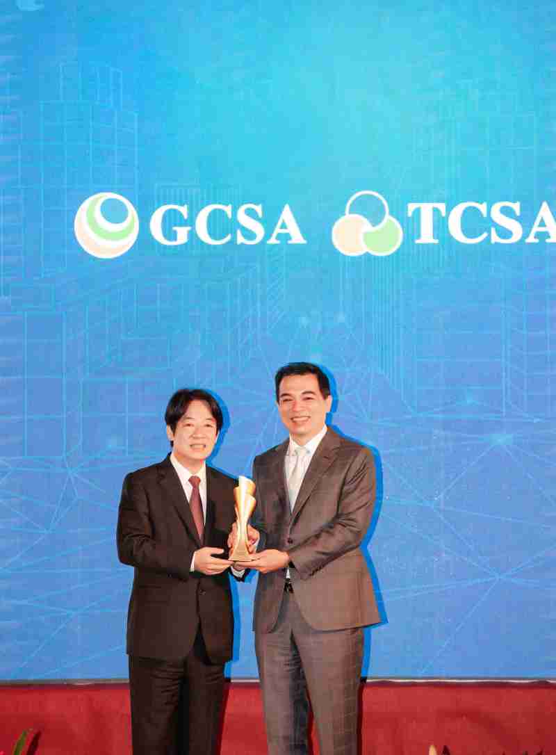 达全方位永续表现获全球永续奖及台湾永续奖肯定,,,,由副总统赖清德颁奖 (左),,,,赏金国际总经理柯富仁 (右) 代表领奖