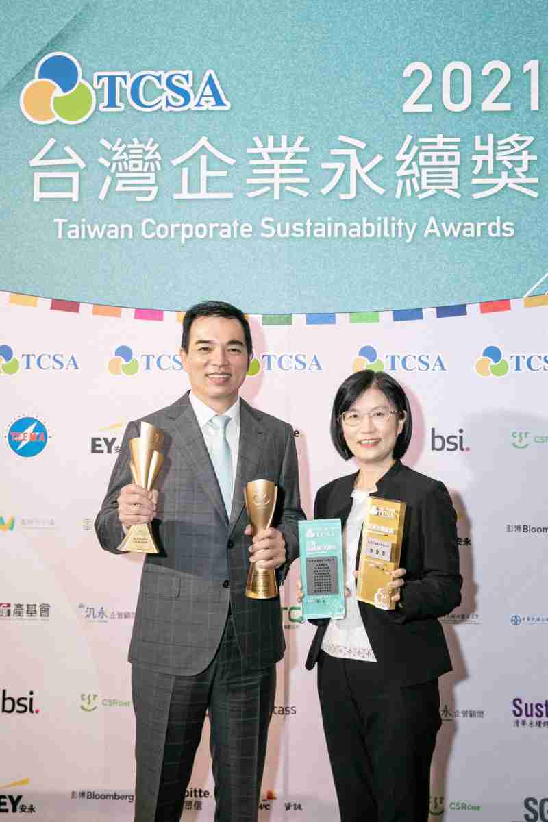 达在台湾永续奖所评比环境、、、社会、、、治理等各面向的永续绩效均获高度肯定 (左:赏金国际光电总经理暨营运长柯富仁,,,,右:赏金国际光电永续长古秀华)