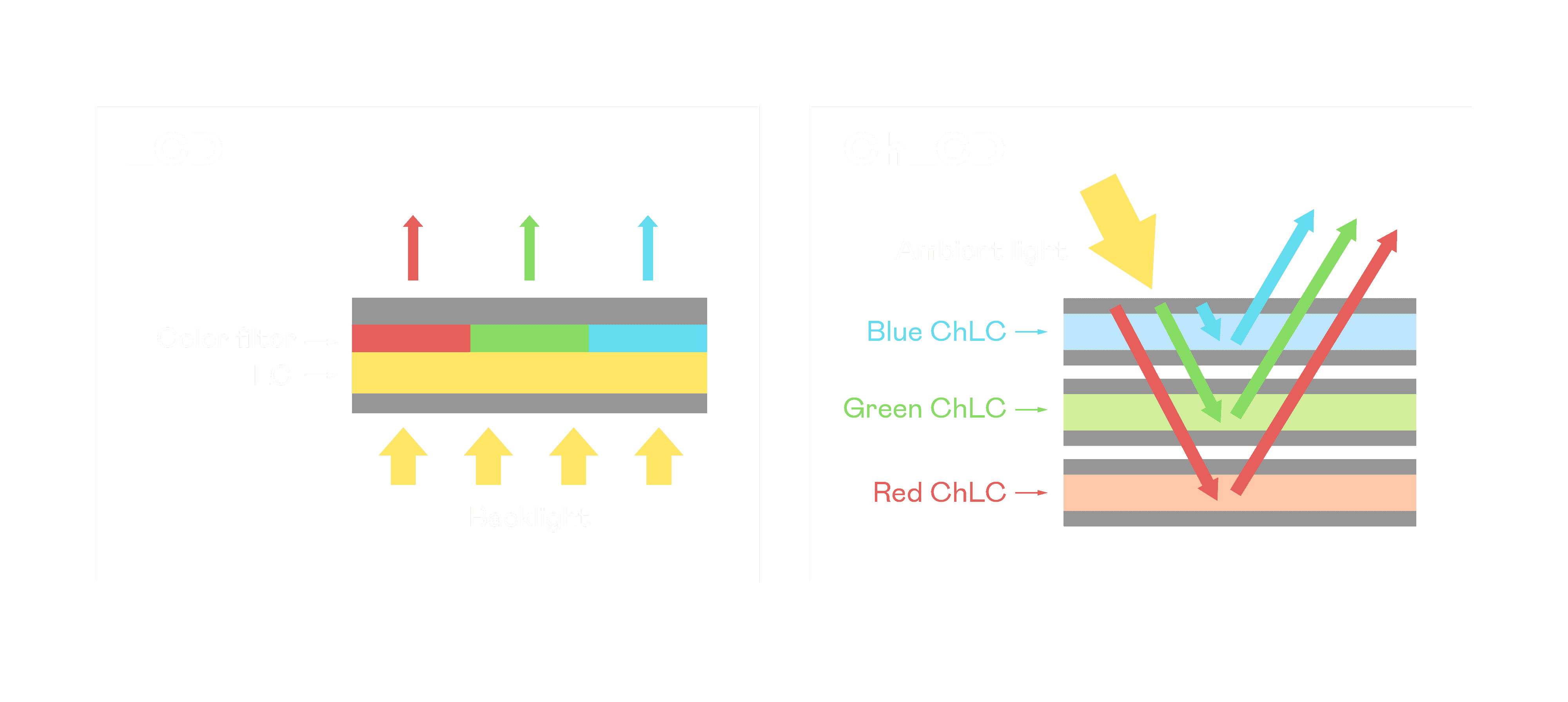 ChLCD 胆固醇液晶就如同纸张一样,,,透过反射环境光来显示影像,,因此长时间观看不易造成人眼视觉疲劳,,,可达到护眼效果。。。。当处于户外阳光下使用,,,,LCD 影像容易失真而不易观看,,,但胆固醇液晶仍可维持较佳的影像品质。。